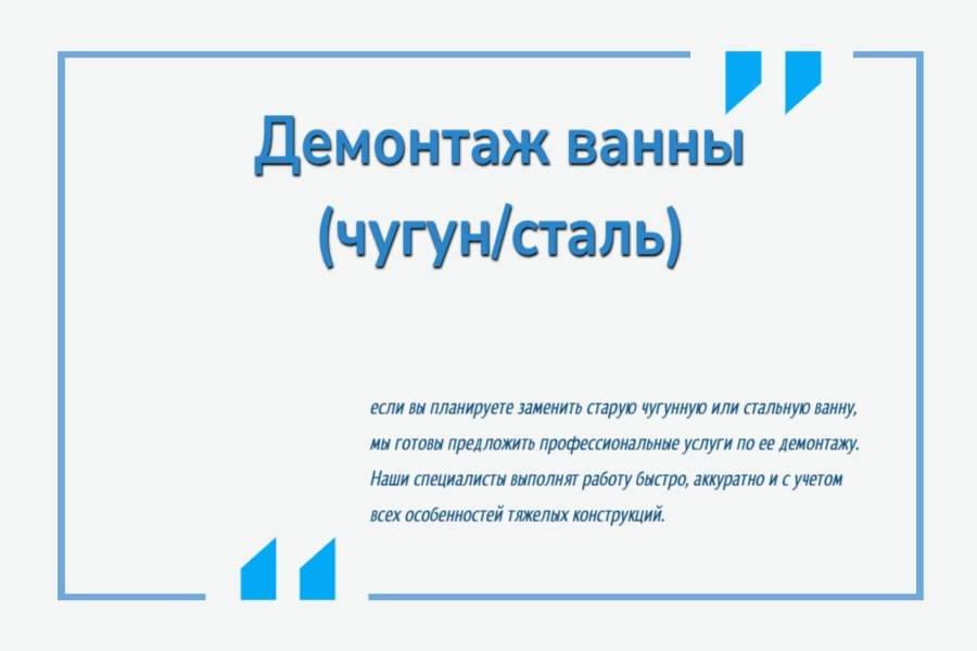 Если вы планируете заменить старую чугунную или стальную ванну, мы готовы предложить профессиональные услуги по ее демонтажу. Наши специалисты выполнят работу быстро, аккуратно и с учетом всех особенностей тяжелых конструкций.