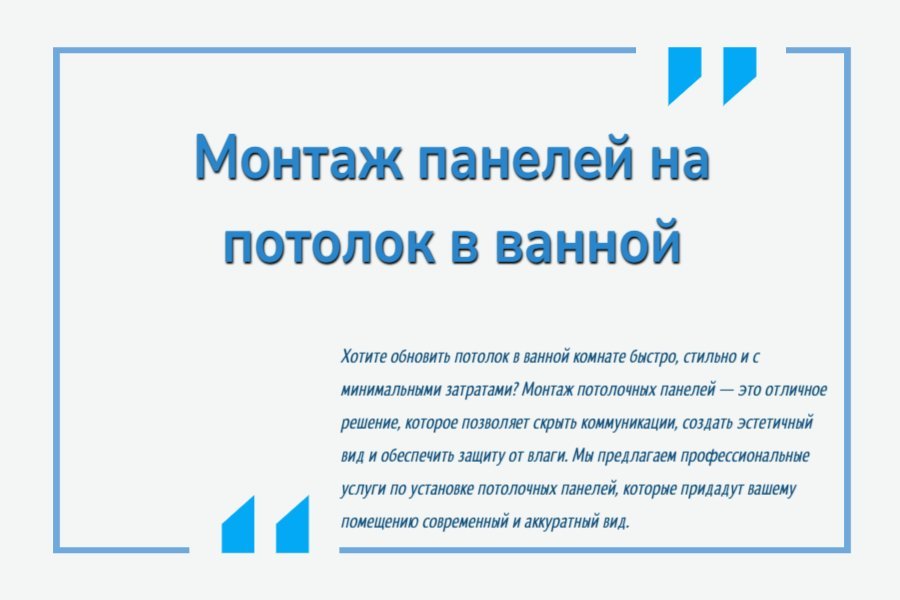 - Опыт и профессионализм: Наши мастера имеют многолетний опыт установки потолочных панелей в ванных комнатах, что гарантирует высокое качество и долговечность работ.