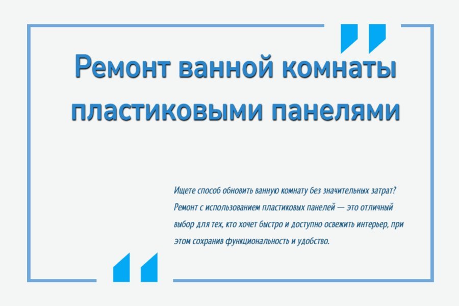 - Короткие сроки выполнения: Благодаря быстроте монтажа пластиковых панелей, ремонт ванной комнаты займет минимальное время.
